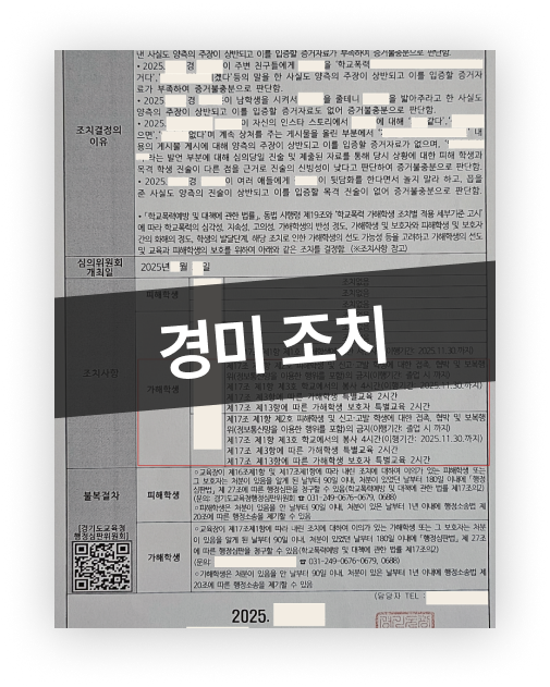 그 결과, 학교폭력 해당성은 일부 인정되었으나 사안의 성격과 반복성 여부, 피해 정도 등을 고려해 전학·학급교체 등 중한 조치로의 확대 없이 교육적 조치 범위에서 사건이 정리되었습니다.