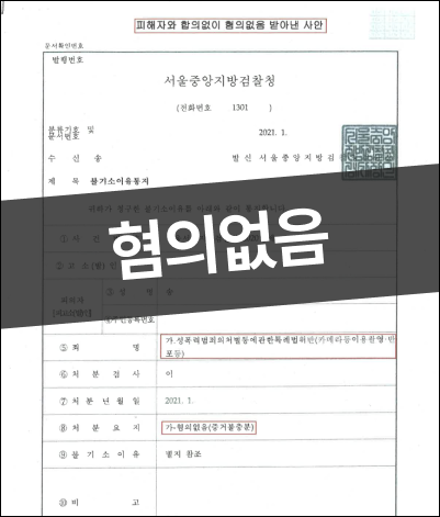 덕분에 법무법인 이든을 통해 증거가 불충분함을 충분히 피력하여 결과는 증거불충분으로 인한 혐의없음으로 정해졌습니다.