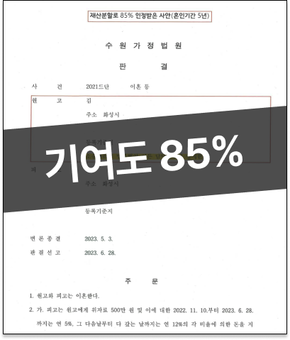 혼인기간 5년이며 재산분할로 85% 인정받은 사안