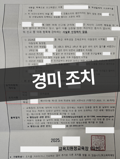 그 결과, 학교폭력 해당성은 일부 인정되었으나 사안의 성격과 반복성 여부, 피해 정도 등을 고려해 중한 조치로의 확대 없이 최소한의 교육적 조치로 사건이 정리되었습니다.