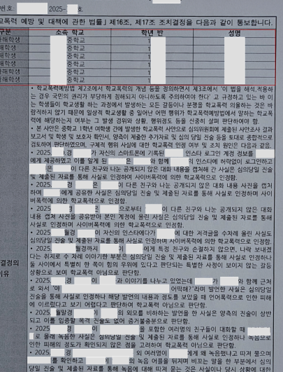 심의 결과, 비공개 대화 캡처 공유 및 게시와 관련된 일부 내용은 사실로 인정되어 사이버폭력에 의한 학교폭력으로 판단되었고, 그에 따른 조치결정 통보가 이루어졌습니다.