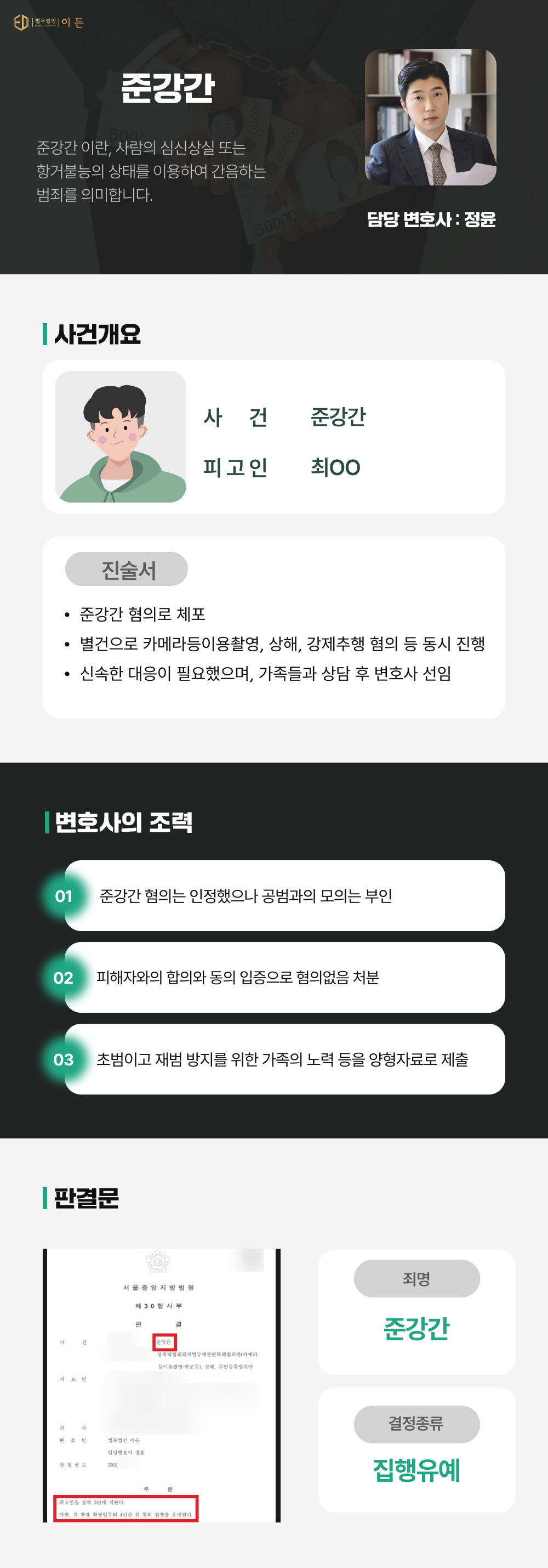 다만, 공범의 존재가 있었기 때문에 자칫 준강간죄가 아닌 특수준강간죄 혐의로 조사를 받을 수 있어 매우 위험한 상황이었죠.